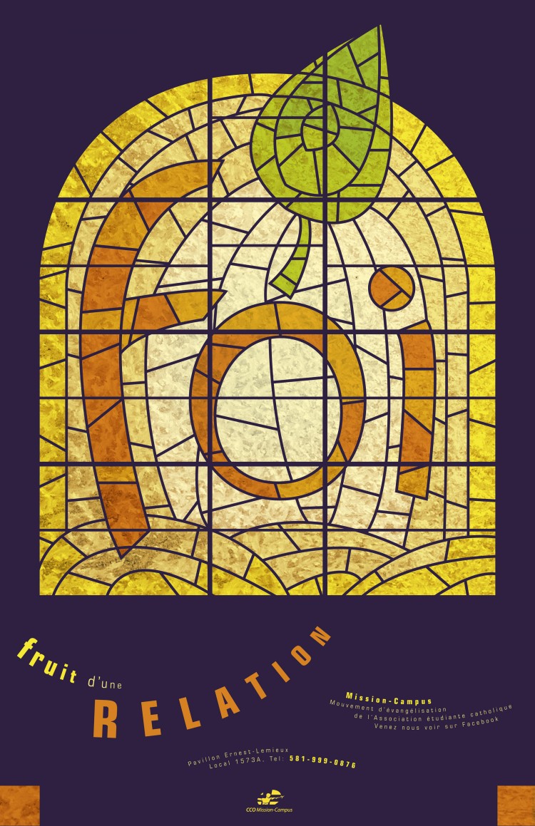 Affiche pour le mouvement d’évangélisation CCO Mission Campus. Thème religieux, miser sur l’aspect chaleureux et les valeurs. Projet universitaire avec un client réel. Format de 22″ X 34″.